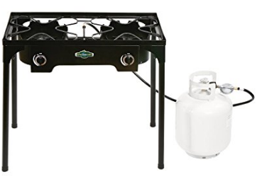 - Two 5,000 to 35,000 BTU cast iron burners on a one piece steel frame